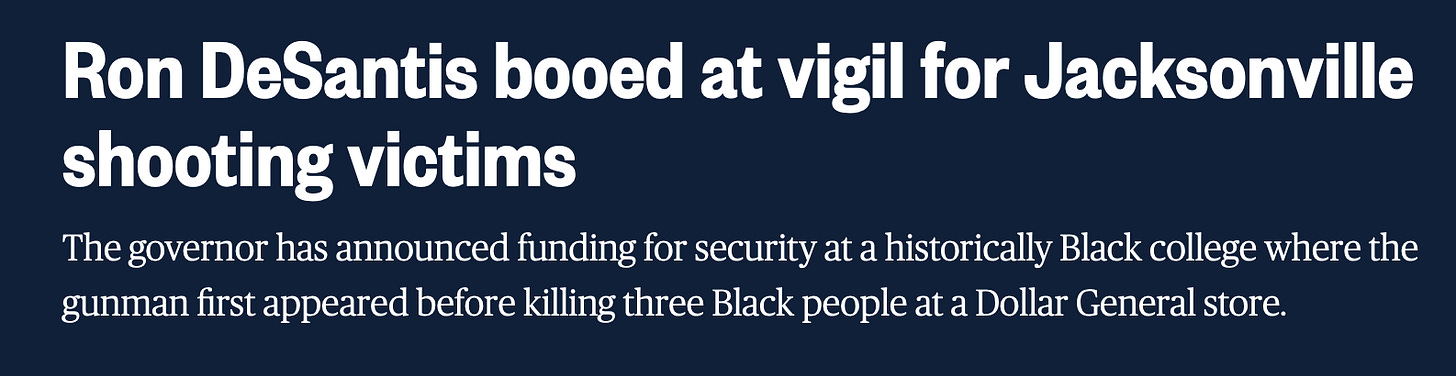 NBC News says Ron DeSantis was booed at a vigil for Jacksonville shooting victims. After saying slavery conferred benefits to black people, DeSantis had to show up at a historically black college to condemn the type of behavior his own rhetoric encourages. I hope the point is obvious. Ron DeSantis falls into the emotional trap of thinking woke ideology is the problem without questioning what impact he has on the situation. Not only his own impact, but the impact of other people like him. People such as his donors and voters.